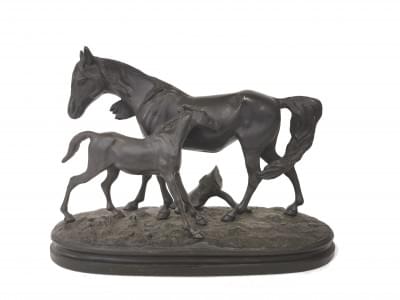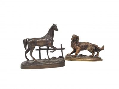 Le cheval signé Lecourtier, le chien Vidal, bronzes à patine bru...