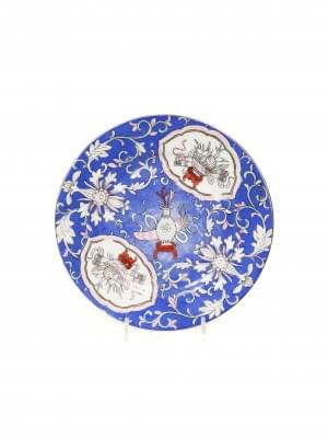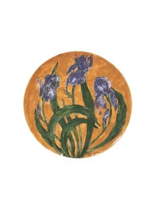 Faïence émaillée à décor d’iris sur fond orange, D 32 cm