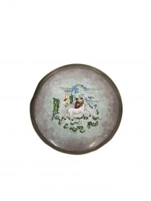 Métal blanc émaillé, monogrammé PI, D 18 cm