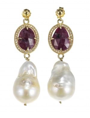 3042. Pendants d'oreilles retenant une perle baroque rehaussée de rubi...