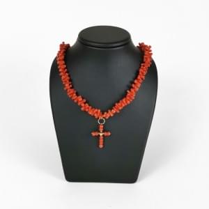 3118. Collier composé de bâtonnets de corail, retenant une croix serti...