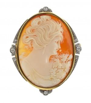 3150. Broche sertie d'un camée sur coquillage à portrait de femme ento...