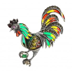 3185. *Broche à motif de coq émaillé serti d'un diamant et d'une émera...