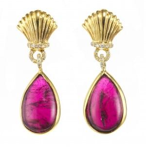 3196. *Pendants d'oreilles retenant une goutte de tourmaline cabochon...