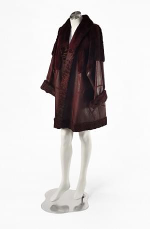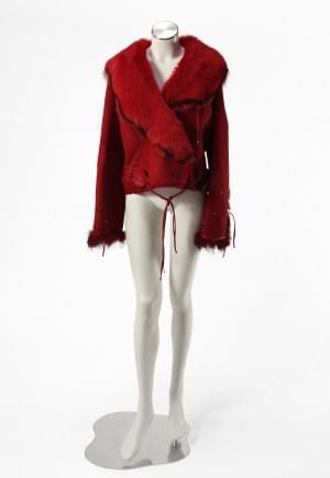 Mouton retourné, fourrure de renard et cuir rouge, fermeture à b...