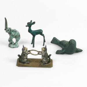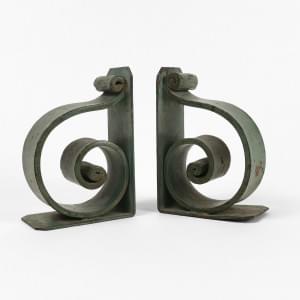 Paire de serre-livres à enroulements, fer forgé patiné, H 13 cm