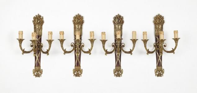 3894. Suite de quatre appliques à trois lumières en forme de torche de...