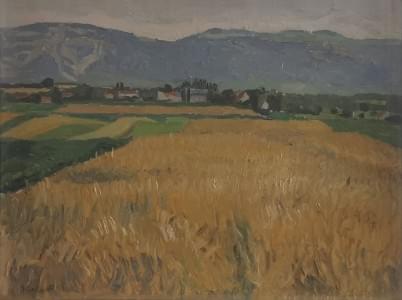 Champs de blé face au Jura, huile sur carton, signée et datée 53...