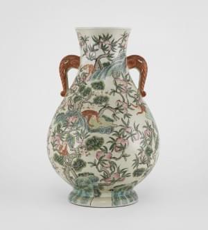 Porcelaine émaillée polychrome à décor de pêches et singes, H 38...