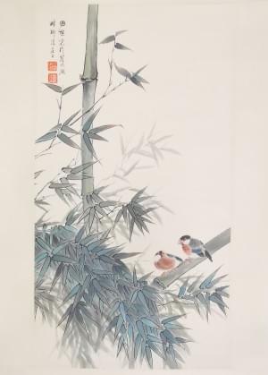 Moineaux sur bambous montés en rouleau, encre sur papier, signée...