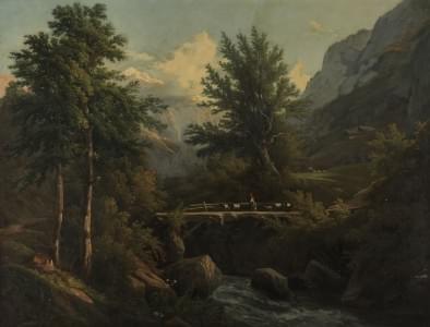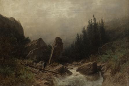 Chasseur au bord d'un torrent dans les Alpes, huile sur panneau,...