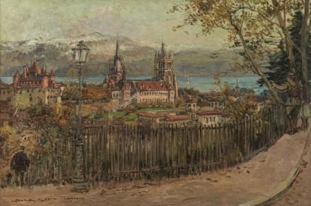 Vue de Lausanne, huile sur toile, signée et située, 49x73 cm