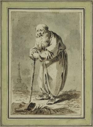 Pélerin, lavis d'encre sur papier, signé et daté 1776, 22x16.5cm