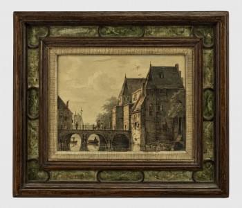 Porte de ville hollandaise, lavis d'encre et aquarelle sur papie...