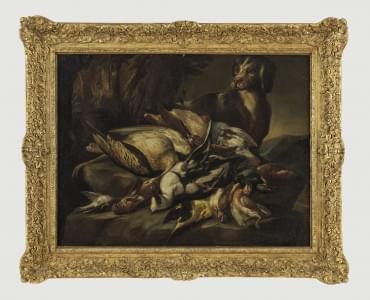 Nature morte en plein air avec gibier et chien de chasse, huile...