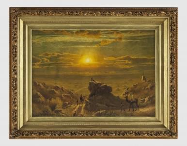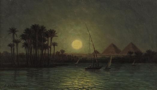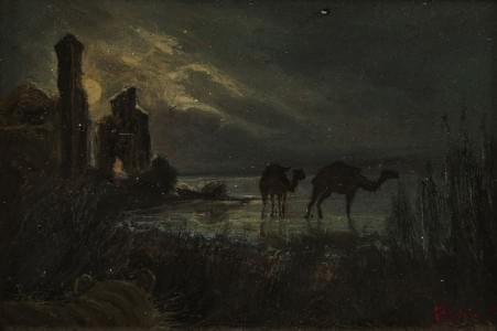 Scène nocturne près des pyramides, huile sur toile, 20x32 cm