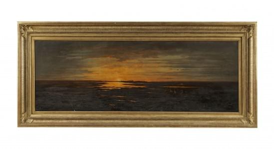 Paysage de pêcheurs sur l'étang, huile sur panneau, signée, 18x4...