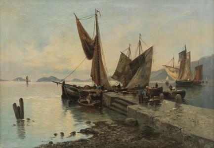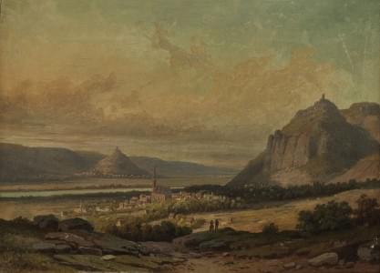 Vue d'une ville le long d'un fleuve, huile sur toile, 46x61 cm