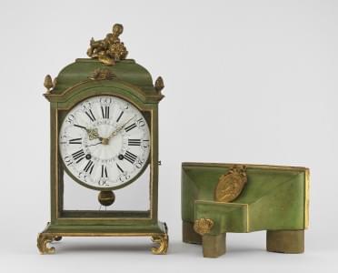 Surmonté d'un putto avec panier de fleurs, bois laqué vert, cadr...