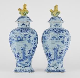 426. Paire de potiches surmontées de lions, Delft, XIXe s