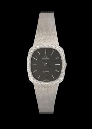 171. Omega, montre bracelet rectangulaire à quartz sertie de diamants