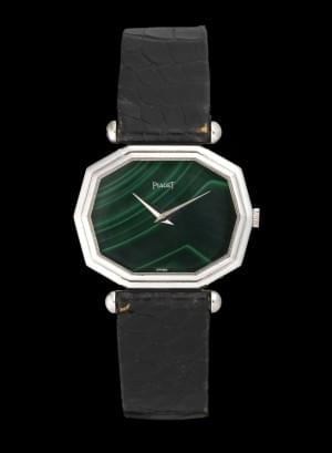 Cadran malachite, aiguilles argentées, or gris 750, 24x31 mm, po...