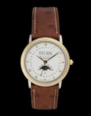 Cadran blanc, aiguilles argentées, chiffres romains noirs, date...