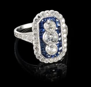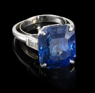 220. Bague sertie d'un saphir (env. 10 ct) épaulé de deux diamants ta...