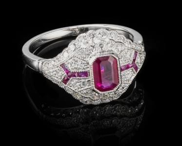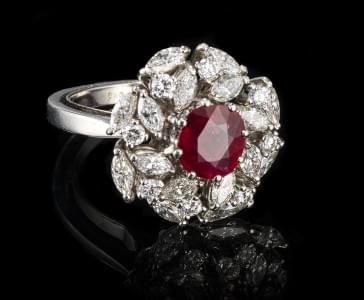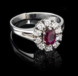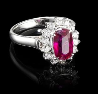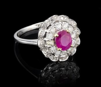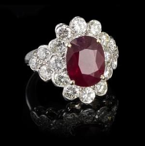 254. Bague sertie d'un rubis (env. 1 ct) entouré de diamants taille m...