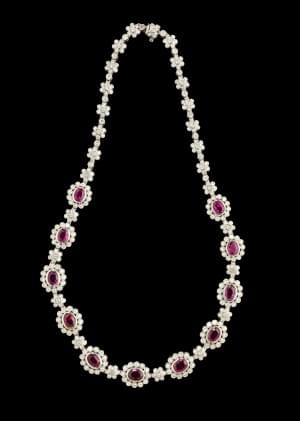 245. Collier composé de médaillons centrés de rubis (env. 16 ct) ento...