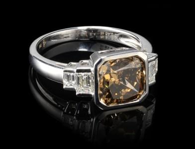 296. *Bague sertie d'un diamant cognac taille coussin (3,18 ct) épaul...